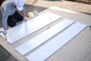 展示会用の「ひよこ豆みそ」のポスター写真を自宅で撮影している様子です。